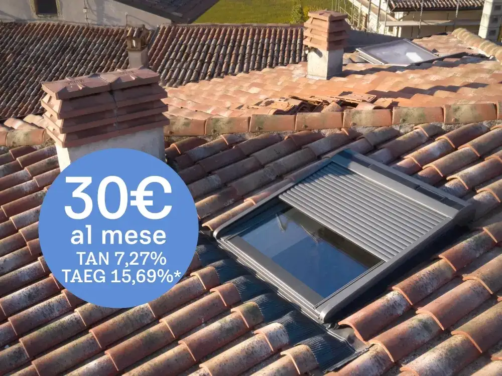 *Messaggio pubblicitario con finalità promozionale. Per le condizioni contrattuali si veda il documento "IEBCC" presso la Sede Fiditalia. Importo finanziabile fino a € 50.000. Esempio: Prezzo del bene: € 1.000,00 (IVA inclusa) – Anticipo: € 0,00 - Importo totale del credito € 1.000,00 - Prima rata a 60 gg - Durata del contratto di credito n. 39 mesi con 38 rate mensili da € 30,00 - Importo totale dovuto € 1.267,82. TAN fisso 7,27% TAEG 15,69%. Spese di gestione del finanziamento ricomprese nel TAEG: Spese di istruttoria pari a €0,00 - Imposta di bollo €16,00 – Spese incasso rata €3,00 – Spese invio rendiconto €1,20 (annui) più imposta di bollo €2,00 per saldi superiori a €77,47. VELUX Italia s.p.a. opera quale intermediario del credito in regime di non esclusiva con Fiditalia. La valutazione del merito creditizio è soggetta all'approvazione di Fiditalia SpA. Offerta valida sino al 31/08/2025.