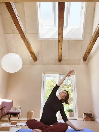 3. Allenamento confortevole in tutte le stagioniCon le schermature esterne per le finestre per tetti VELUX proteggi la mansarda da caldo e abbagliamento e ti alleni sempre nel massimo comfort.